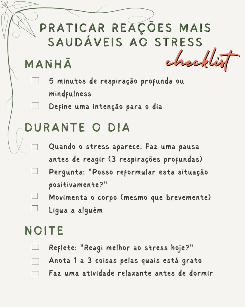 🧘♂️ Uma lista de verificação diária simples para que possas praticar reações mais saudáveis ao stress e manter a consistência: