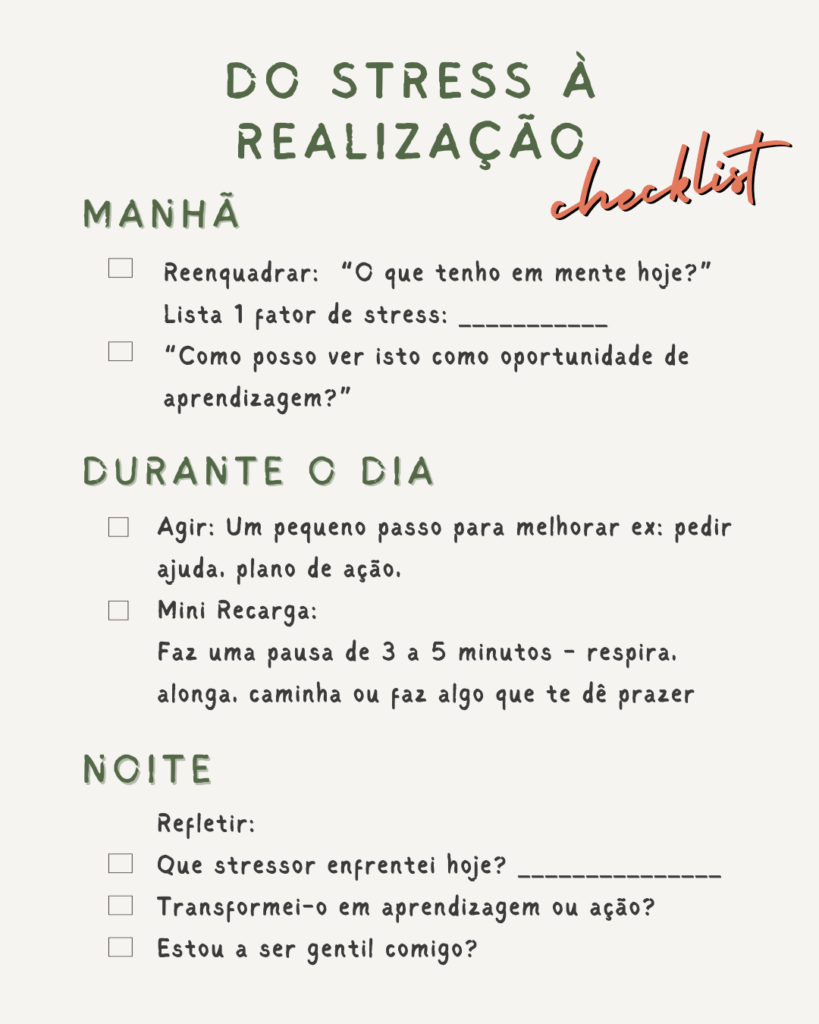 No final do dia, reflete rapidamente: “Onde enfrentei o stress e o transformei em ação ou crescimento?” Mesmo as pequenas vitórias valem a pena ser notadas pois reconfiguram o teu cérebro para associar o stress à realização.